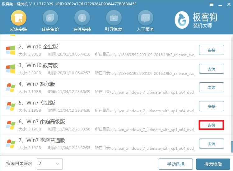 4、馬上進入極客狗PE系統,裝機軟件會自動搜索系統鏡像打開,用戶選擇要安裝的操作系統點擊“安裝”。